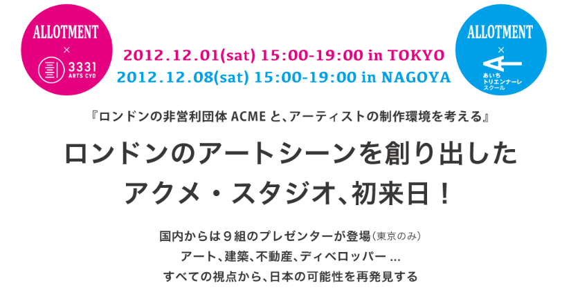 2012年のALLOTMENTは、ロンドンから非営利団体ACME(アクメ・スタジオ)を招き「アーティストの制作環境を考える」というテーマで、東京と名古屋でイベントを開催いたします。1972年にロンドンに創立されたアクメ・スタジオは、これまでロンドン市内にある使われていないスペースを、アーティストのアトリエや展示室へと変えて利用する組織の運営を行ってきました。アクメ・スタジオメンバーの来日ははじめてとなります。ロンドンの華々しいアートシーンを支えてきた、アクメの歴史を語っていただきながら、日本での可能性を模索する機会になればと企画いたしました。東京ではアーツ千代田3331にて、名古屋ではトリエンナーレスクールの一環として行われます。皆様、ぜひともご参加下さい!