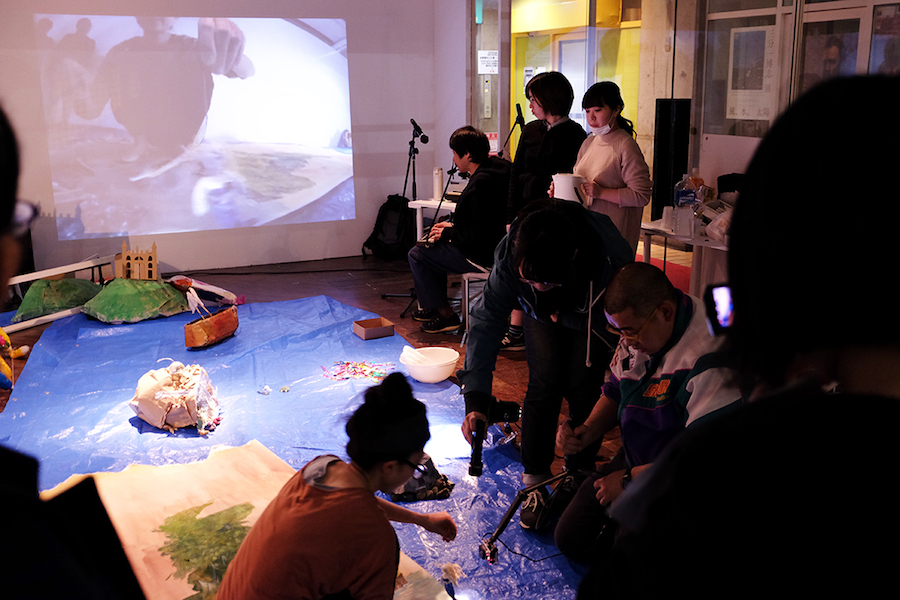 4| 音楽家 野村誠・やぶくみことの共同制作(ジオラマ上で物語朗読・実演を行い、その様子をピンカメラで撮影投影し即興で演奏)/ ARTZONE(京都市)/ 2016