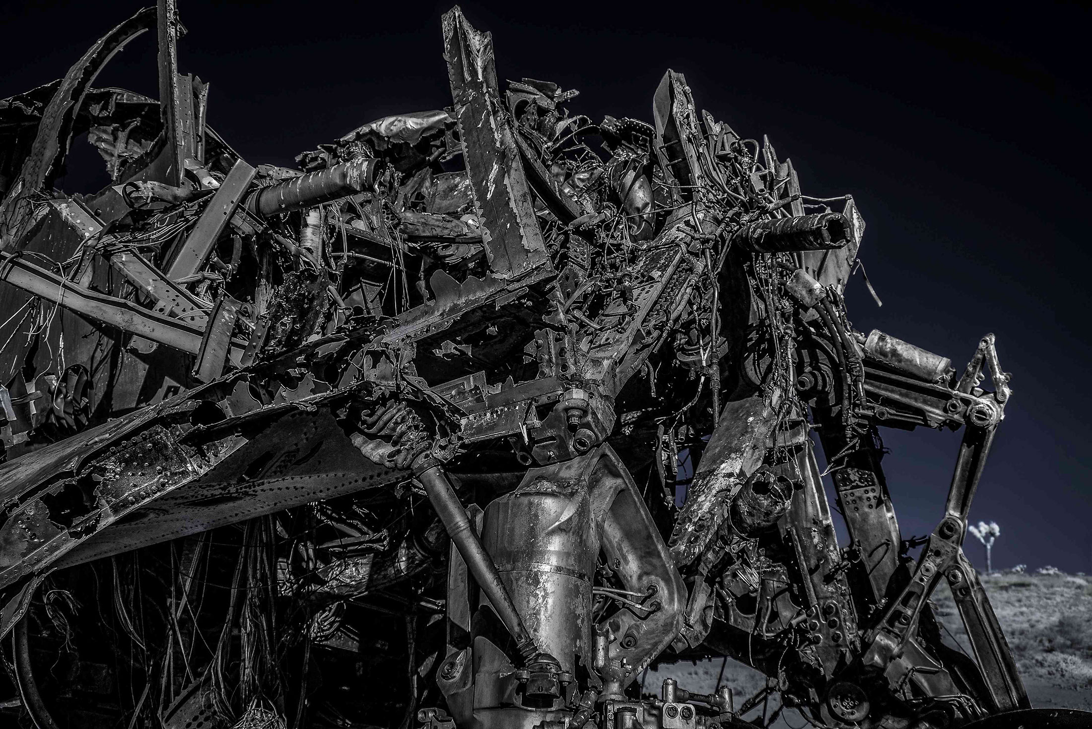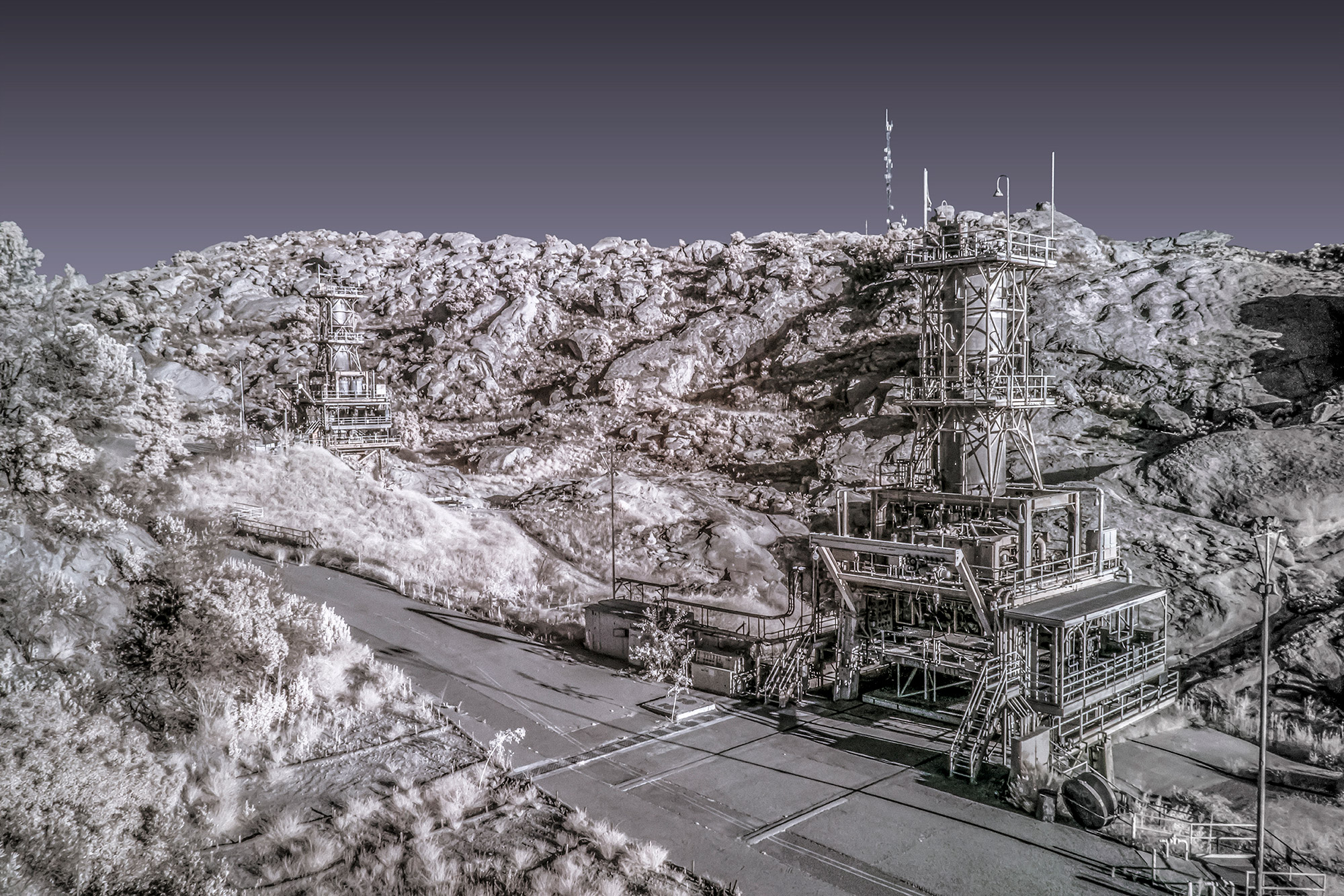 近赤外線カメラで撮影された作品は、人工物と生物の物質的な違いを浮き彫りにするだけでなく、朽ちる運命にある”過去の産物”と今を生きる”生命”を対比させ、真実であるにもかかわらず、まるでSFのようなディストピア的な世界を創りあげている。そして新たな関係性のランドスケープとして、次の世界に繋がる光景を共有する事がテーマである。”自然”と人間が残した”人工物”との相互関係を表現する為に、それぞれを分けて可視化できるよう近赤外線カメラを使用し被写体を撮影している。